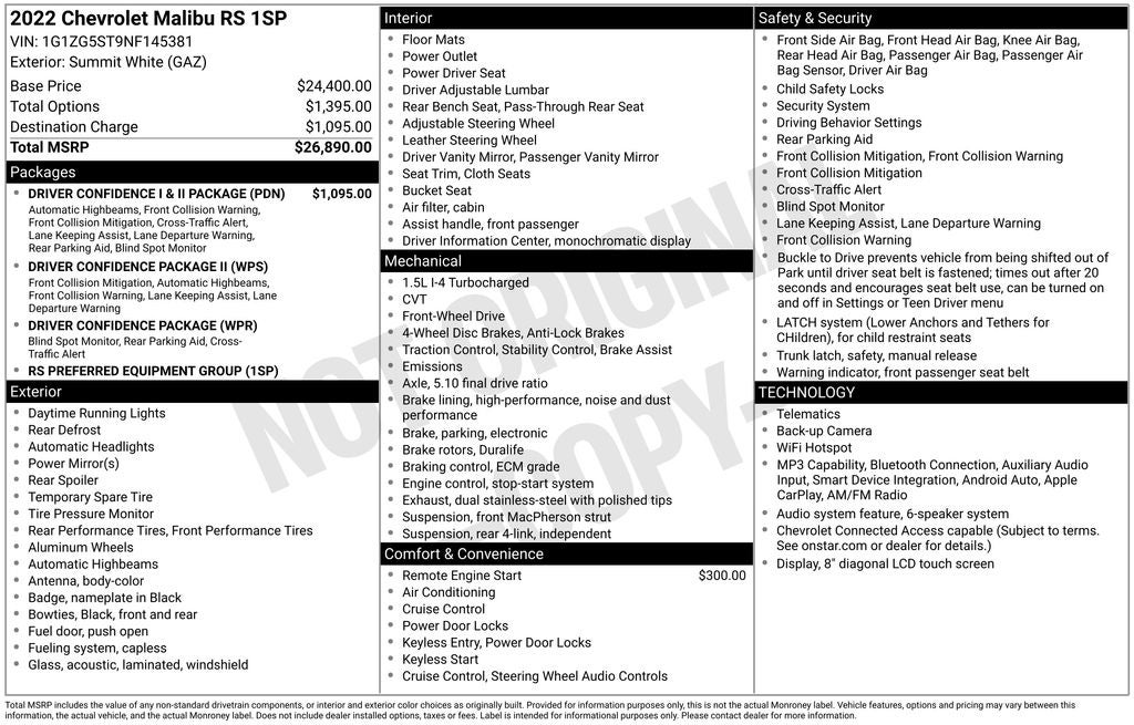 - Vehicle Name: Chevrolet Malibu