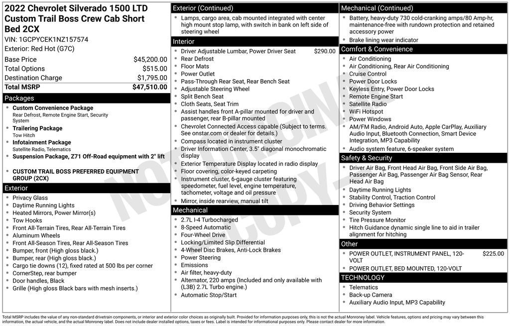 - Custom Convenience Package includes (BTV) Remote Start with (UTJ) content theft alarm, (C49) rear-window defogger, (UF2) bed LED cargo area lighting and (QT5) EZ Lift power lock and release tailgate